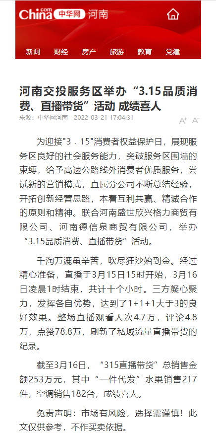 中華網(wǎng)、中原網(wǎng):河南交投服務(wù)區(qū)舉辦“3.15品質(zhì)消費、直播帶貨”活動 成績喜人