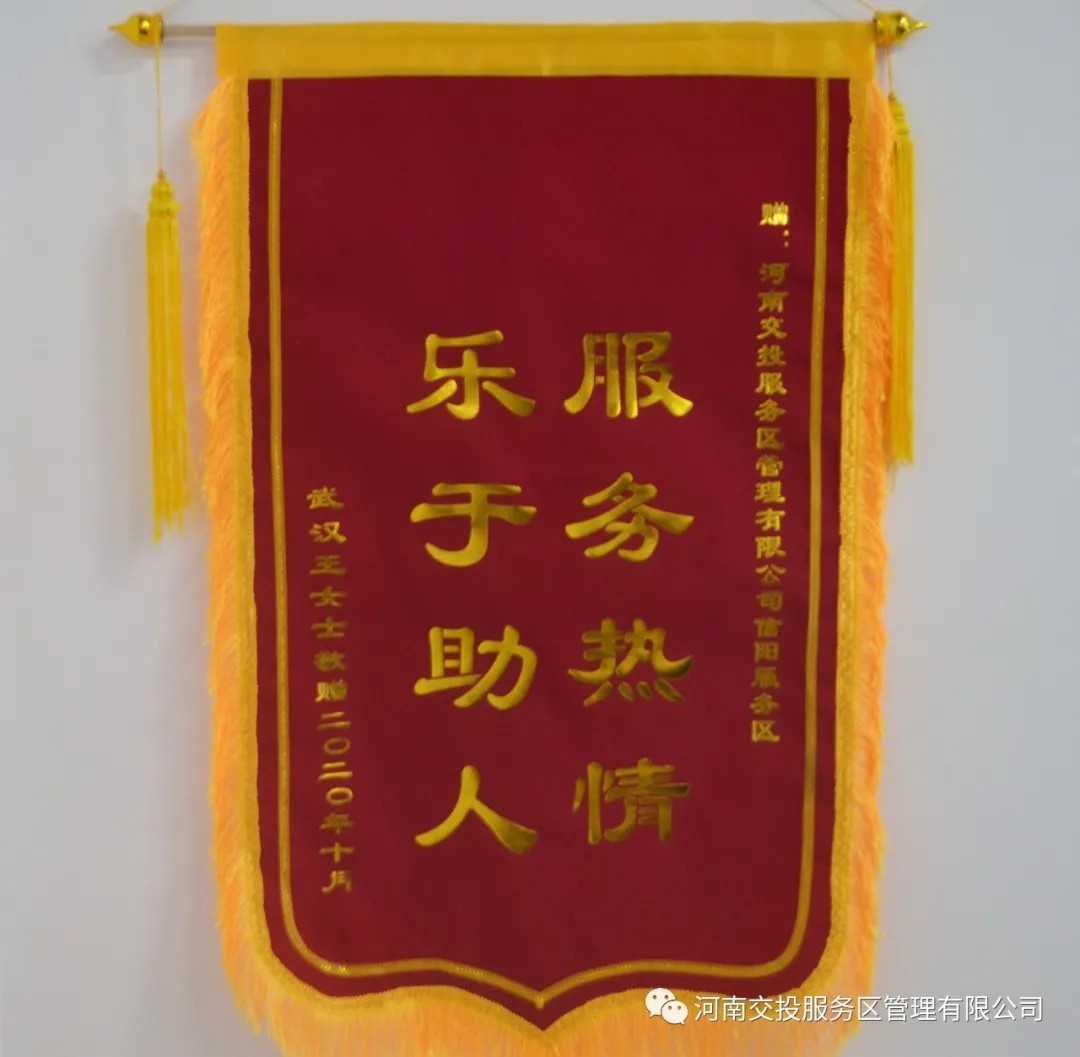 2020-10-14 作者:“信陽服務區急乘客所急,因工作原因無法親自送達,只能郵寄,為你們的熱心服務點個贊!”10月14日,信陽服務區收到一面由武漢王女士寄來的寫有“服務熱情 樂于助人”的錦旗。原來10月8號下午,正值雙節假期返程高峰,王女士帶著兩個孩子開車途徑信陽服務區停歇時,不慎將車鑰…
