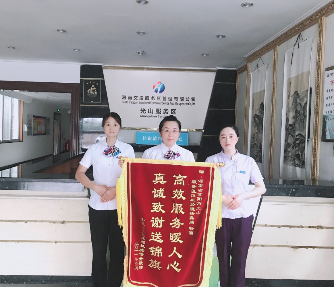 7月4日,光山服務(wù)區(qū)收到由安徽六安貨車郵寄來的的一面錦旗,上面寫著“高效服務(wù)暖人心 真誠致謝送錦旗”。